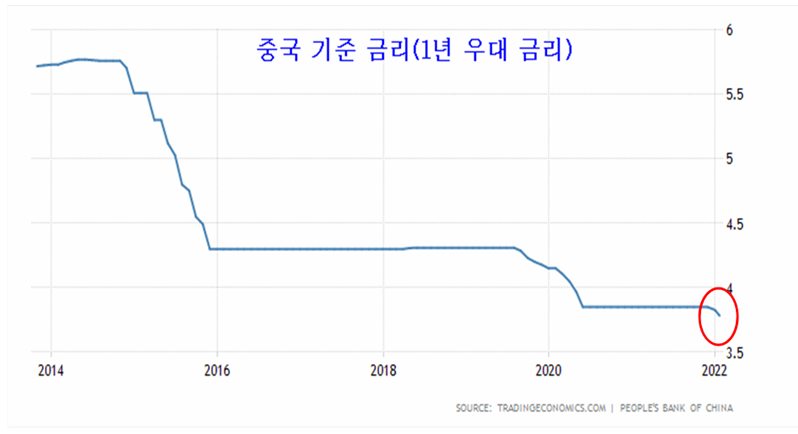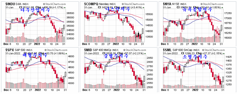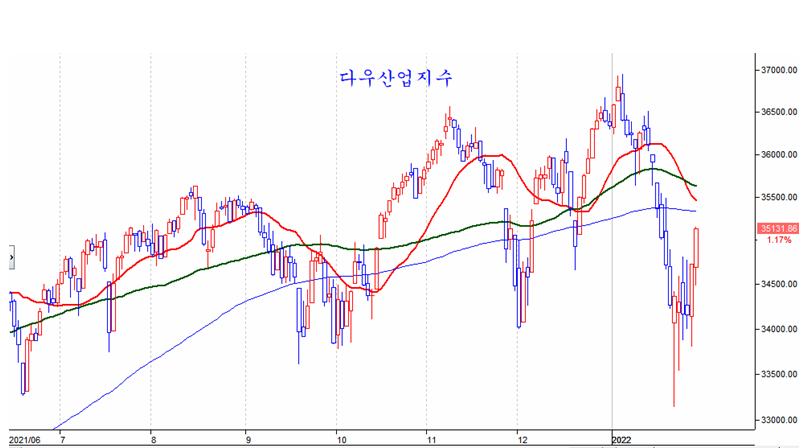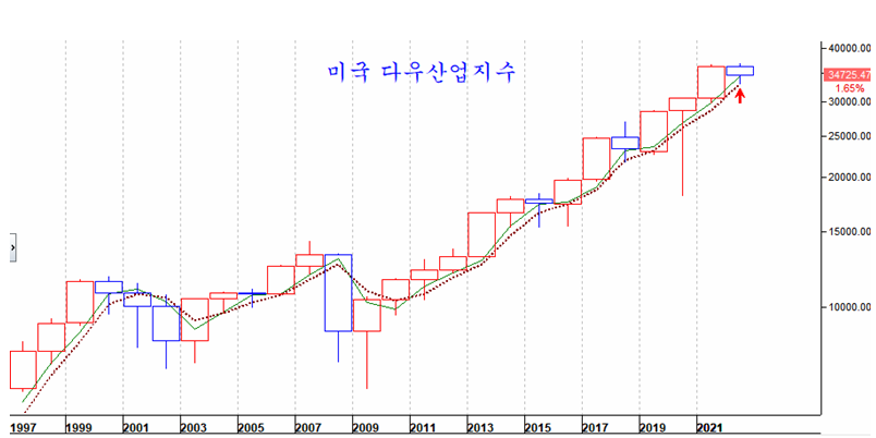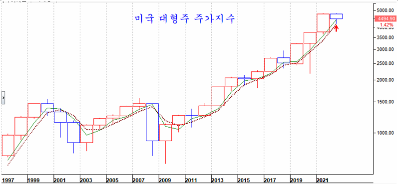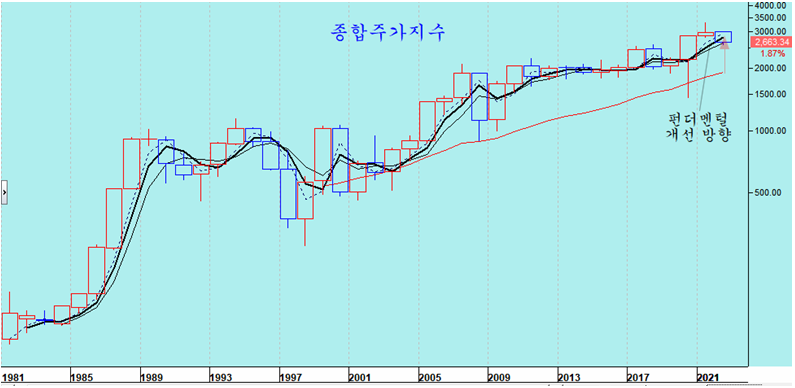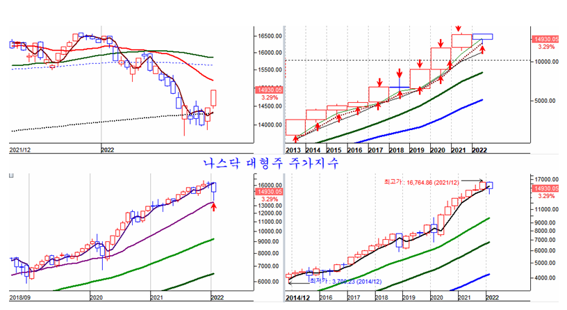 미국을 비롯한 중국과 한국 등 주요국 주가지수의 20월 평균 또는 60주 평균이 상승 방향을 나타내는 것은 현재 세계 경기가 회복 추세이고 기업들의 실적이 개선 추세임을 반영한다. 이 추세 회복은 완만하지만 2020년 주가가 지나치게 빠르게 상승하면서 이격이 발생하였으므로 2021년에 이어 2022년 초 조정으로 이격을 조정한 것이라 할 수 있다.