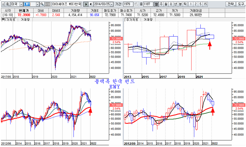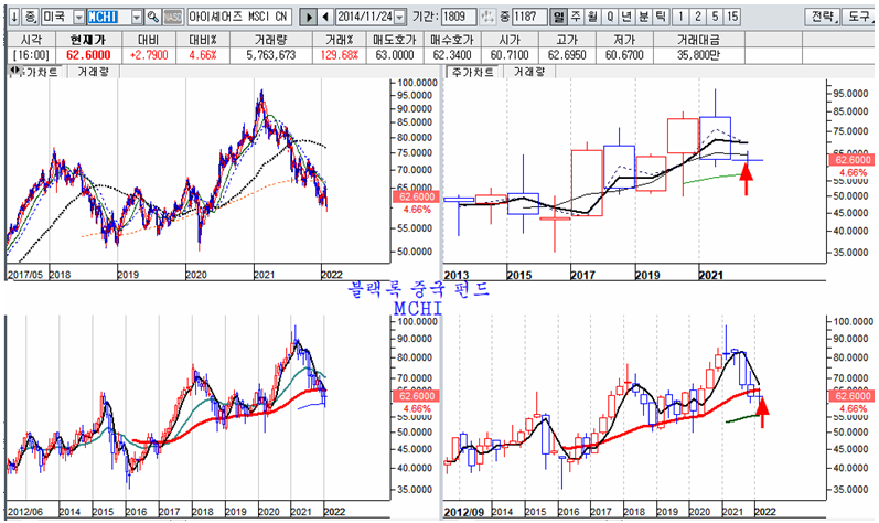 아울러 지난해 하락 조정에 이어 연초 조정이 이어졌던 블랙록 중국 펀드 MCHI와 블랙록 한국 펀드 EWY는 적어도 3년 이상의 기간에 한번 나타나는 60월 평균에 접함으로써 드문 매수의 기회가 되어 있다.