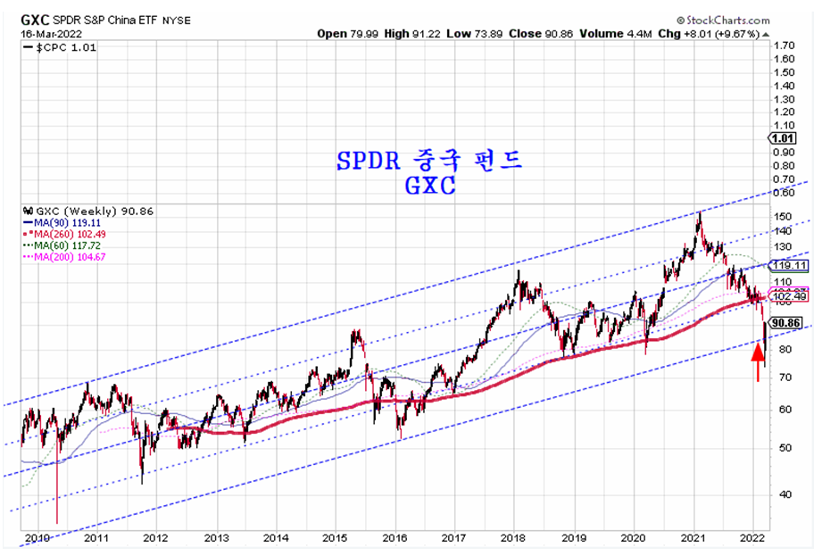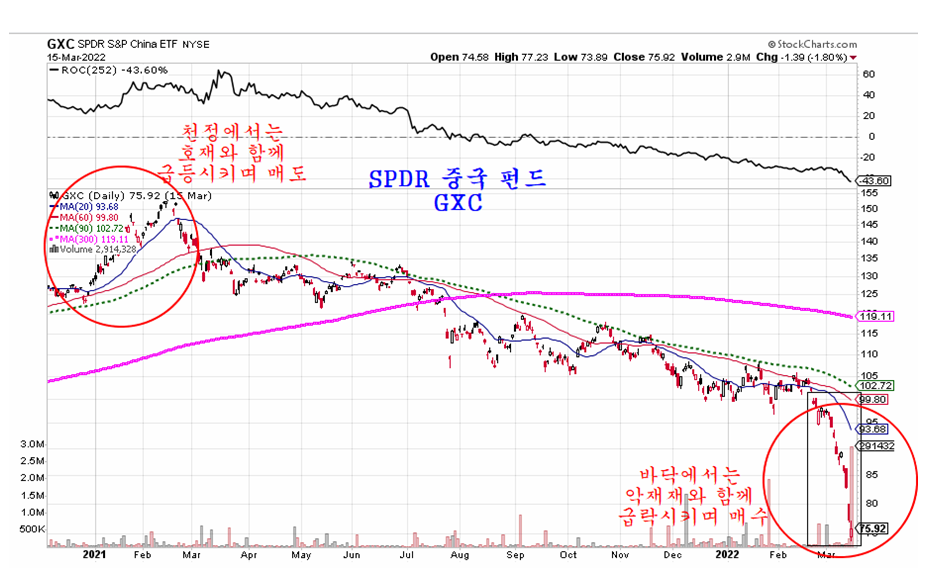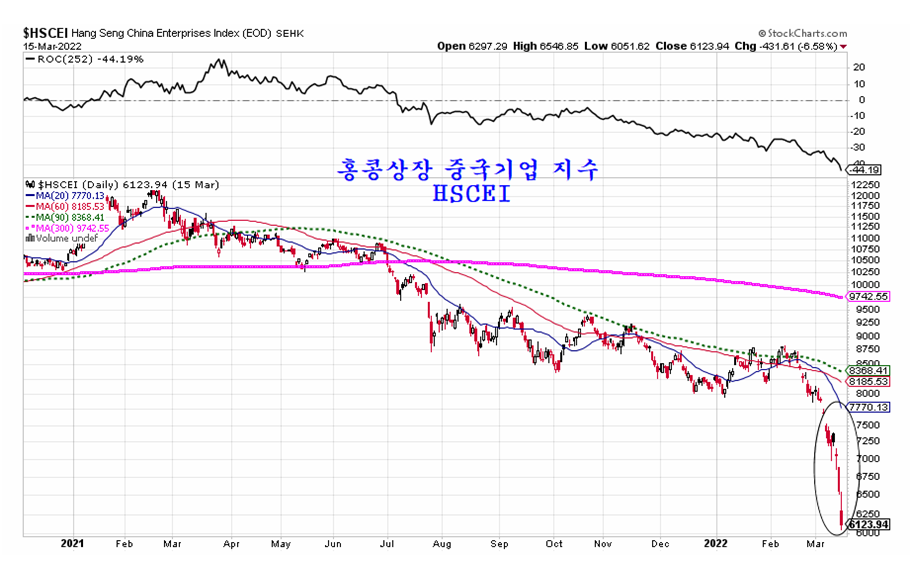 주가가 이렇게 급락을 하는 이유는, 러시아가 우크라이나를 침공했거나, 중국 경기가 어려워지거나, 기업 실적이 악화되기 때문이 아니다. 앞으로 대세 상승을 앞두고 중국 기업과 펀드를 보유하고 있는 일반의 물량을 매물로 유인하여 값싸게 매수하기 위한 과정이다. 주가의 장기 또는 대세 상승은 거의 대부분 이런 과정을 거쳐서 신용투자자의 물량을 반대매매로 유인하고, 기업 펀더멘털을 모르는 모멘텀 투자자들을 두렵게 하여 물량을 확보한다.
