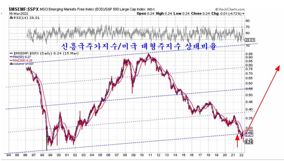 지난 11년 동안 첨단 기술 무대면 서비스업으로 특징지어지는 미국 대형주지수는 원자재가공 대면 제조업을 특징으로 하는 신흥국 주가지수에 비해 상대적으로 크게 올랐다. 그러나 세계 부동산 경기가 활황기인만큼 지금은 2002년처럼 건설 경기 활황으로 수요가 증가하는 원자재 가격과 함께 제조업 경기가 강한 가운데 신흥국 주가지수가 선진국 첨단기술 서비스 업종을 앞서 상승하는 국면이 시작되고 있다.