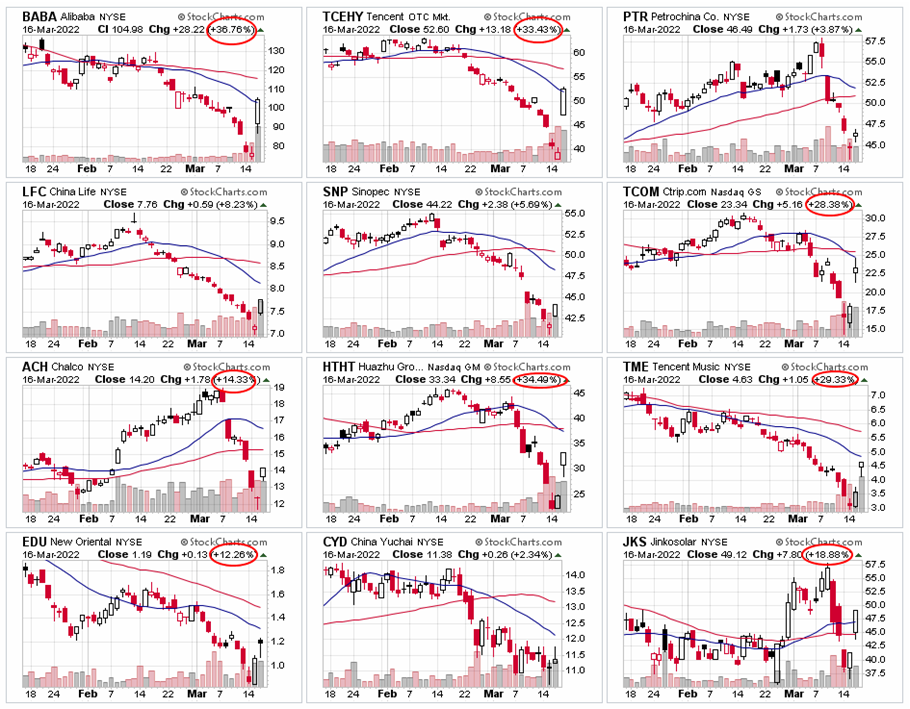 아직 파생상품 만기가 되지 않았지만, 수요일인 16일 뉴욕시장에서는 급락시켰던 중국 기업이 일제히 급등하며 아앨랜드 갭을 만들며 추세 전환이 되어 있다.