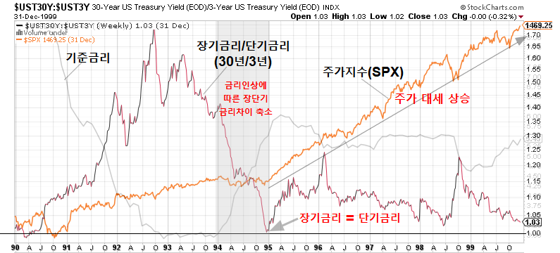 특히 1995년 장단기 금리 역전 후 주가는 무려 5년에 걸쳐 대세 상승을 하였다. 따라서 어떤 경우에는 장단기 금리 역전 후 주가가 더욱 상승이 강해진다.