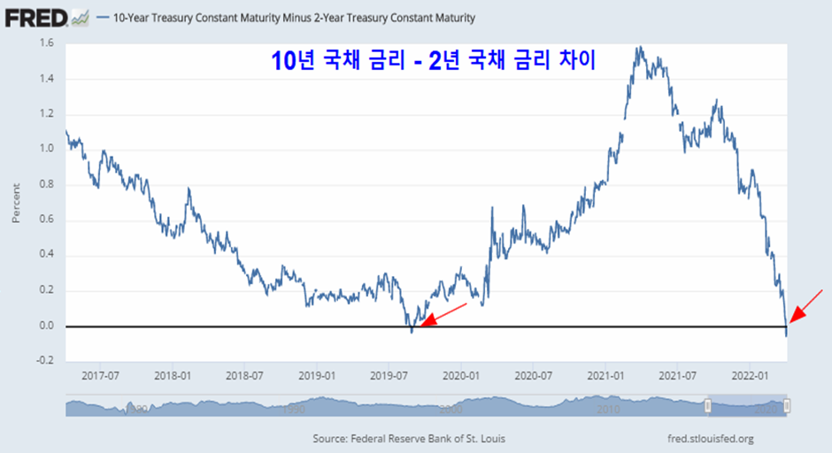 최근 미국 FRB가 기준 금리를 인상함에 따라 단기 금리가 빠르게 오르면서 단기 금리가 장기 금리보다 높아지면서 장단기 금리 역전이 나타났다. 10년 장기채권 수익률에서 2년 단기채권 수익률을 뺀 차이는 마이너스 구간으로 진입하여 있다.