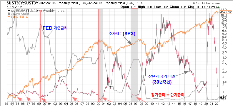 다음은 1983년 이후 30년 장기 국채 수익률을 3년 단기 국채 수익률로 나눈 비율을 미국의 대형주 주가지수인 SPX 지수와 함께 나타냈다.