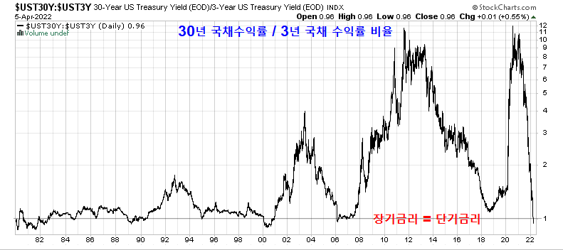 실제 30년 국채 수익률을 3년 국채 수익률로 나눈 비율이나, 20년 국채수익률을 2년 국채 수익률로 나눈 비율은 1.0 이하로 내려 섬으로써 단기국채 수익률이 장기 국채 수익률보다 높은 장단기 금리 역전을 나타내고 있다.