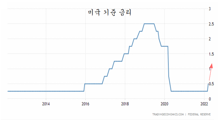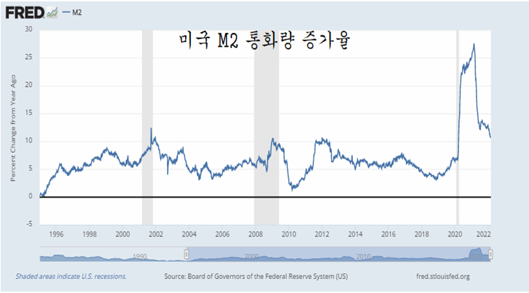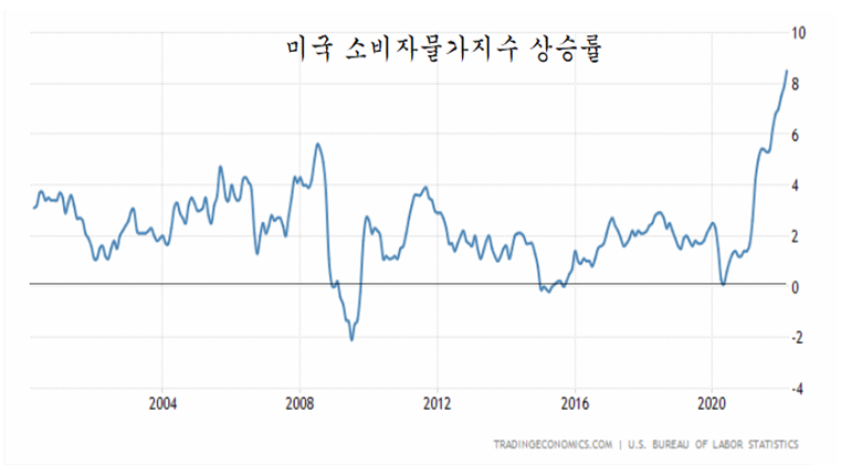 코로나 팬데믹 이후 미국은 통화를 과도하게 풀어 자산과 상품 인플레이션을 겪었었다. 이 때문에 팽창하는 통화에 힘입어 미국은 수혜주인 비대면 서비스와 첨단기술주를 중심으로 강한 주가 상승 국면이 이어졌고, 이와 함께 물가가 빠르게 오르면서 강한 인플레이션이 진행되고 있다. 미국의 소비자 물가상승률은 8.5%로 1970년대 이후 가장 높은 인플레이션이 진행 중이다.