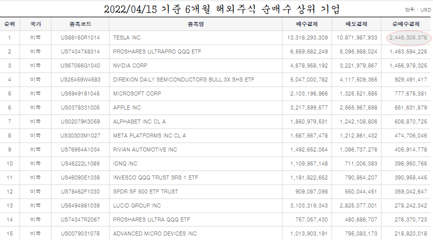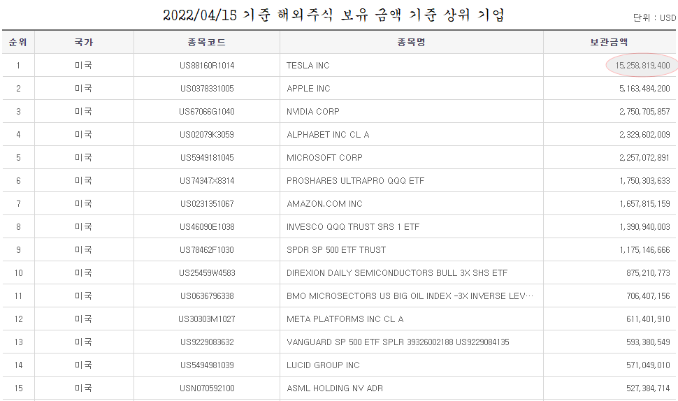 2022년 4월 15일을 기준 한국인이 가장 많은 금액을 보유하는 해외 기업은 152억 달러 규모의 보유 잔고를 기록하는 테슬라 TSLA이다.
