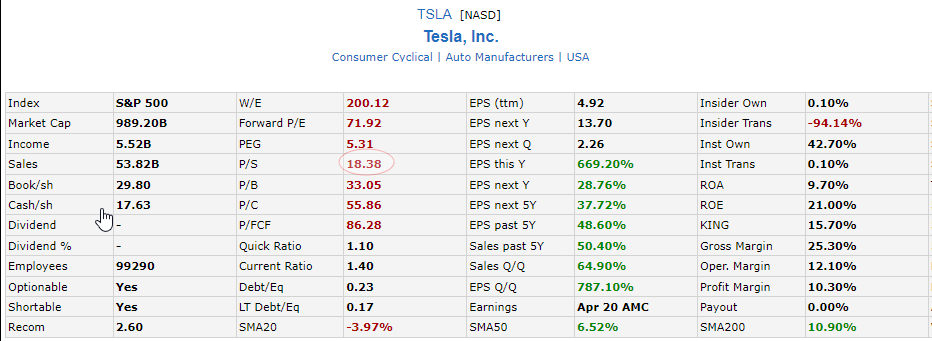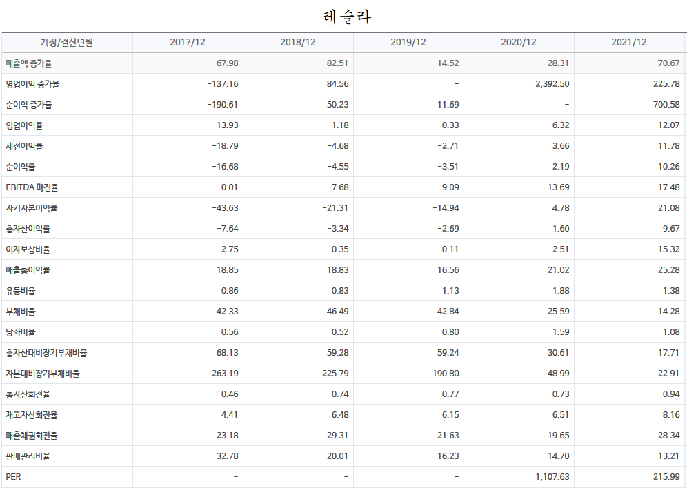 테슬라는 2019년까지 흑자를 내지 못한 기업이었으나, 2020년 코로나 팬데믹으로 인해 전기차용 원자재 가격이 하락하면서 마진율이 개선되고, 전기차에 대한 판매가 증가하면서 2020년과 2021년에 걸쳐 괄목할만한 실적 증가를 나타냈고, 이에 앞서 주가는 빠르게 상승하였다.