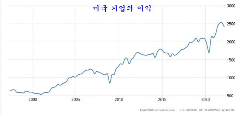 그렇다면 코로나 팬데믹 이후 강하게 오르던 미국 주식 시장은 왜 올 들어 하락으로 전환된 것일까? 그것은 코로나 팬데믹 이후 빠르게 증가하던 미국 기업 실적이 지난해 4분기를 정점으로 감소로 전환되었기 때문이다. 팬데믹 이후 주가가 급등했던 것도 기업의 실적이 빠르게 증가했기 때문이고, 올들어 주가가 하락을 시작한 것도 기업의 실적이 감소로 전환되었기 때문이다.