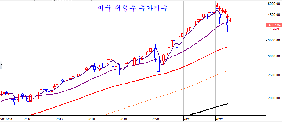 이 말은 곧 미국의 경기가 위축되면서 미국 기업의 실적이 감소하고, 주가지수가 하락을 계속한다는 의미이다. 따라서 월말이나 월초 반등으로 월봉 이격이 좁혀지면 다음 달 다시 하락이 시작되면서 월간으로 하락 추세가 계속됨을 의미한다.