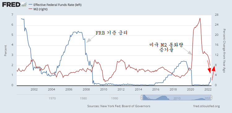 코로나 팬데믹 이후 미국 주가가 강한 상승을 했던 것은 미국 FRB가 돈을 풀어 시중에 공급했기 때문이고, 지난 연말을 정점으로 올 들어 기업의 실적이 감소하고 따라서 주가지수가 하락한 것은 FRB가 돈을 푸는 속도를 빠르게 줄이고 있기 때문이다.