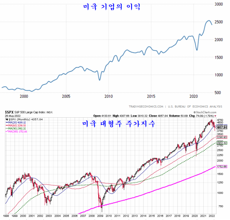 좀 더 긴 시간에 걸쳐 기업의 이익과 미국 주가지수를 비교해 보면 아래와 같다. 분명 관련성이 있어 보이는 기업의 이익과 주가의 관계를 잘 알지 못하는 이유는 주가를 너무 짧은 시간의 관점에서 보기 때문이다.