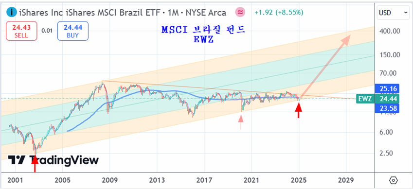쥬라기: 달러 환율이 반영된 한국펀드 EWY와 브라질 펀드 EWZ의 가격구조는