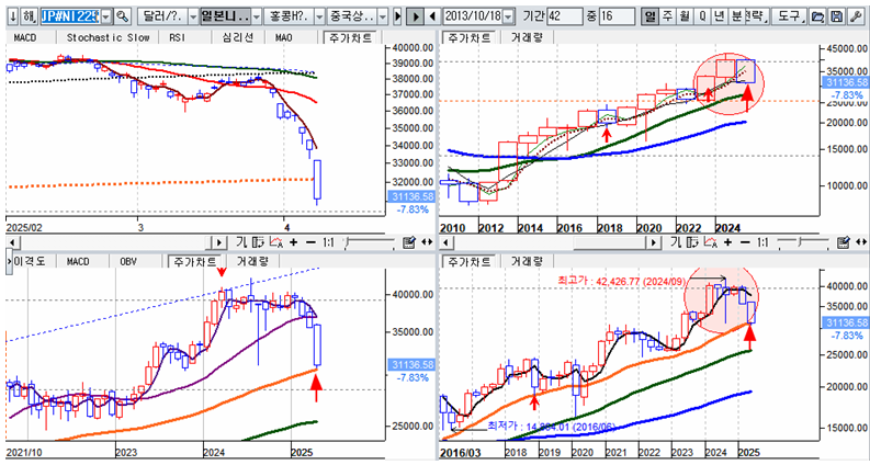 쥬라기: 일본 니케이지수는 오늘 7.8% 하락으로 60월, 20분기, 5년 평균에 접했죠.