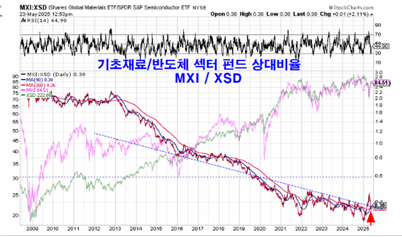 쥬라기: 기초재료섹터 펀드 MXI를 반도체 섹터 펀드 XSD로 나눈 상대비율은