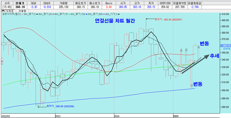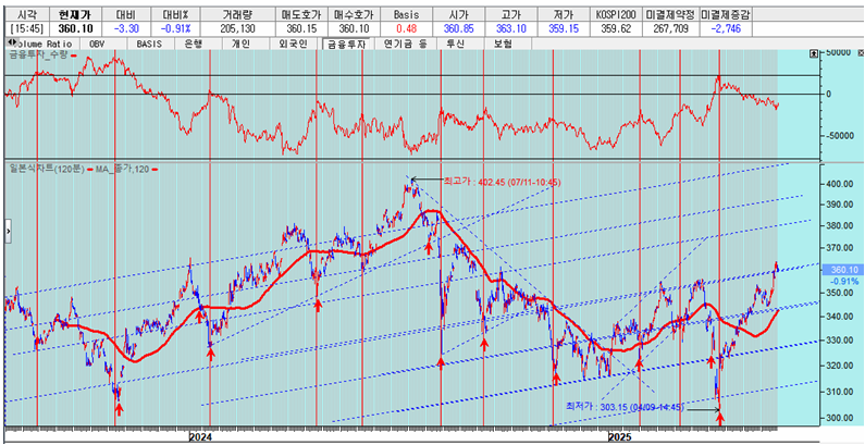 쥬라기: 6월 평균 추세인 시가3선이 340 근처이므로 대략 20정도 변동여지가 있죠.