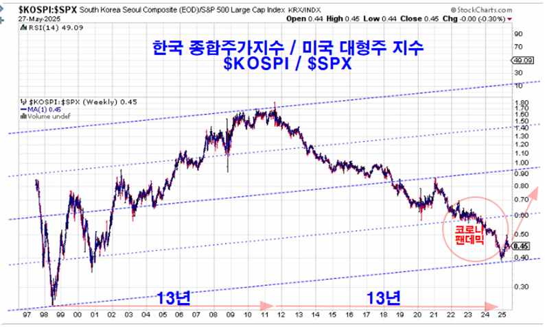 쥬라기: 사실 종합주가지수 KOSPI를 미국의 대형주지수 SPX로 나눈 상대비율은