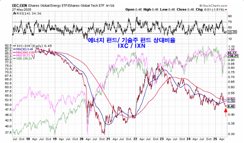 쥬라기: 미국 시장에서 에너지 펀드와 기술주 펀드의 상대비율 연간 변동사이클 및