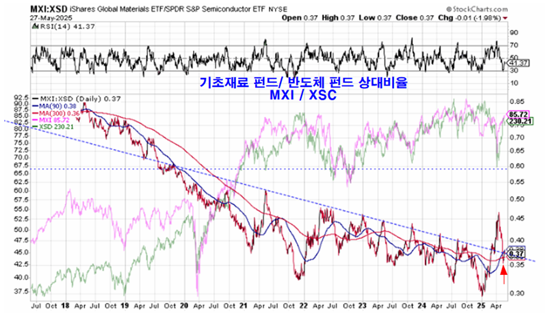 쥬라기: 기초재료 섹터 펀드와 기술주 펀드의 상대비율 연간 변동사이클이