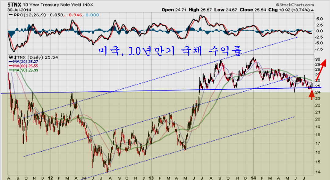 미국의 10년 만기 국채수익률을 보면 2.5%를 지지로 하여 더 이상 하락하지 않고 상승으로 전환하고 있다. 1분기에는 의외로 마이너스 성장을 보인 경제 때문에 채권 강세가 가능했지만, 2분기 성장률이 4.0%를 넘는 것으로 나타나고 소비자 물가 상승률이 2.0%를 넘어선 지금 추가 하락의 기대는 무모하다.