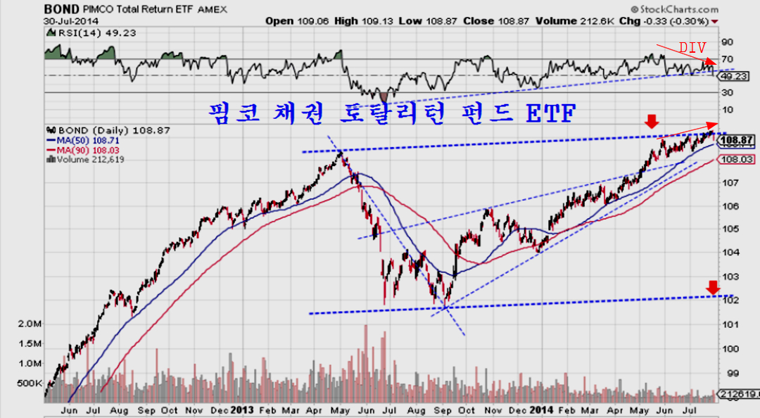 이에 따라 세계 최대 채권 투자회사인 핌코의 채권 토탈리턴 펀드는 다이버전스와 함께 고점에서 밀려 내려오는 모습이 되고 있다.