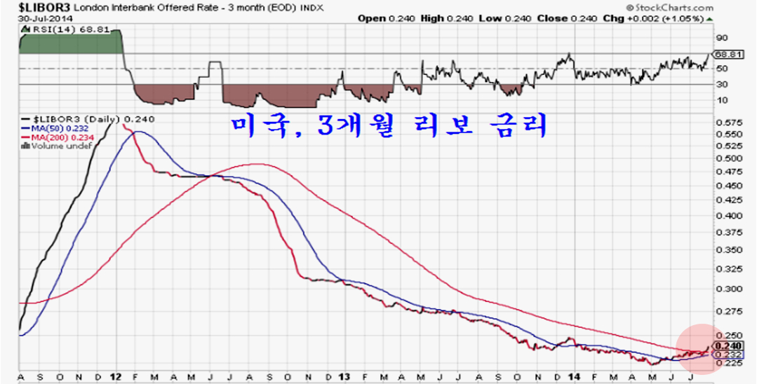특히, 시장은 금리 인상을 기대하듯 3개월 리보금리가 서서히 오름세로 전환되고 있다. 과거 리보 금리는 위기나 악재가 발생할 때 급히 오르는 모습을 보였으나, 지금은 그런 모습과는 달리 서서히 금리가 오르고 있어서 시중 금리의 인상의 압력이 강해지고 있음을 의미한다.