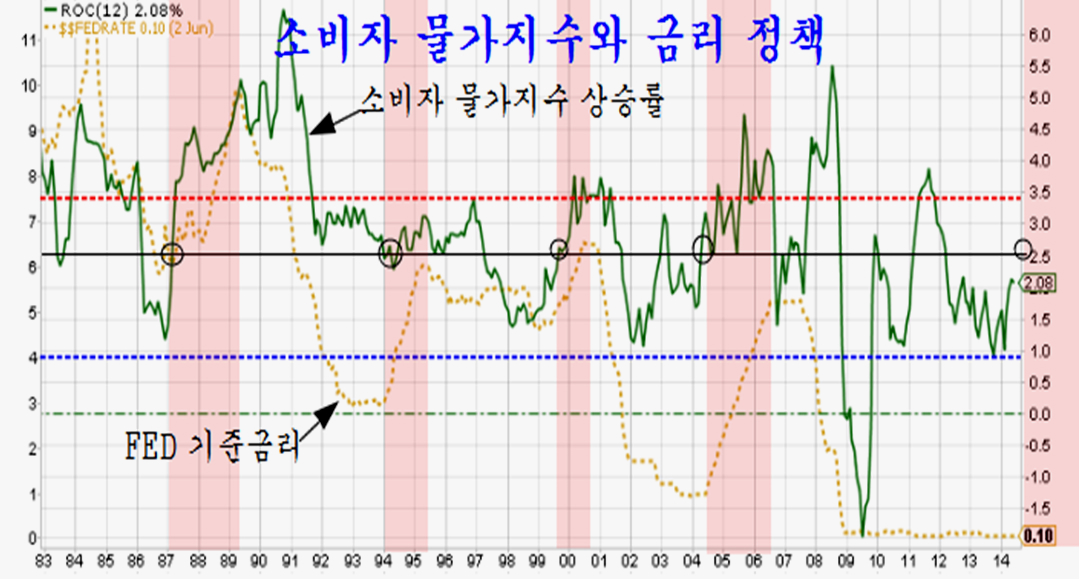 미국의 경우 과거 금리 인상의 조건을 보면, 소비자 물가지수가 2.5%를 넘어서면 곧바로 금리 인상이 개시된다. 이런 점에서 이미 소비자 물가상승률이 2.08% 수준에 있어 인플레 억제 기준인 2.5%까지 불과 0.42%를 남겨두고 있어 제로금리 탈출이 멀지 않았다.