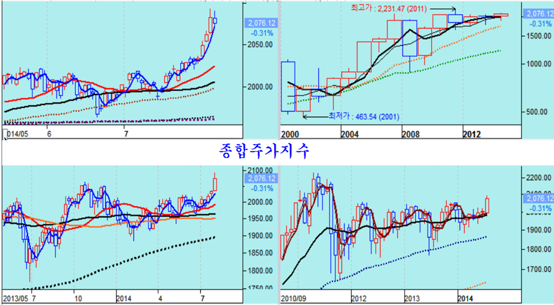 하반기를 시작하는 7월은 외국인의 매수가 강화되면서 3년 만에 박스권을 돌파하는 장세의 변화를 준 가운데 마감했다. 상반기를 2002.21로 마감한 종합주가지수는 7월 첫날 1993.29로 하락 출발한 후 외국인의 매수에 기관의 매수가 가세 하면서 2065에 있던 박스권을 돌파하고 모처럼 3.69% 오른 2076.12에서 마감하였다.