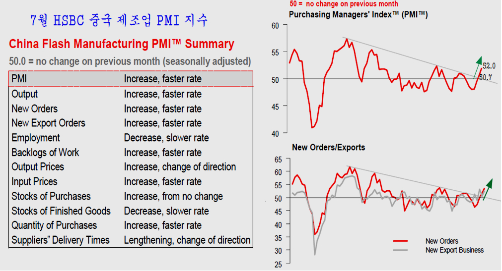 둘째, 모멘텀은 중국발 중국주 모멘텀이다. 중국은 이미 지난 6월 제조업 PMI가 50을 넘어서고 PMI 장기 추세 저항이 돌파되면서 업황 회복을 예고한 데 이어, 지난 7월 24일 예비 성격으로 발표되는 HSBC 제조업 PMI가 52.0으로 상승하며 경기 확장세가 가속되고 있다.