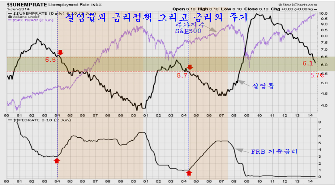 또 하나의 금리 기준은 실업률로, 1990년대에는 6.5% (물가상승률이 2.5%를 넘었기 때문)이었고, 2004년에는 5.7%를 넘으면서 금리 인상이 시작이 되었다. 따라서 적어도 실업률이 5.7% 근처에서 물가상승률 2.5%를 넘으면서 금리 인상 조건이 완벽히 갖춰진다고 하겠다. 그런데 올 연초 6.7%에 달하던 실업률이 지난 5월 기준 6.1%로 빠르게 하락하고 있다 .현재 6.1%의 실업률은 금이 인상 예상 기준인 5.7%로 하락하는 것은 3분기 말이나 4분기 초이다.