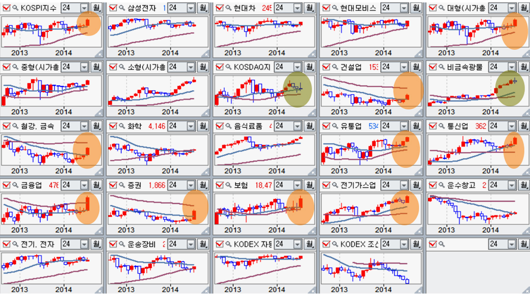 건설, 철강, 증권, 은행 업종이 월봉 20월 평균을 돌파하며 대세 상승의 첫발을 내디뎠고, 음식료, 유통, 통신, 보험, 전기가스 등 월봉 20월 평균과 60월 평균 위에 있는 업종들은 보폭이 작지만 이평선 위에서 상승을 이어갔다. 한편, 중형주, 소형주, 그리고 주도업종인 비금속 광물은 7월 숨고르기 조정과 함께 8월 상승을 준비한 채 마감하였다.