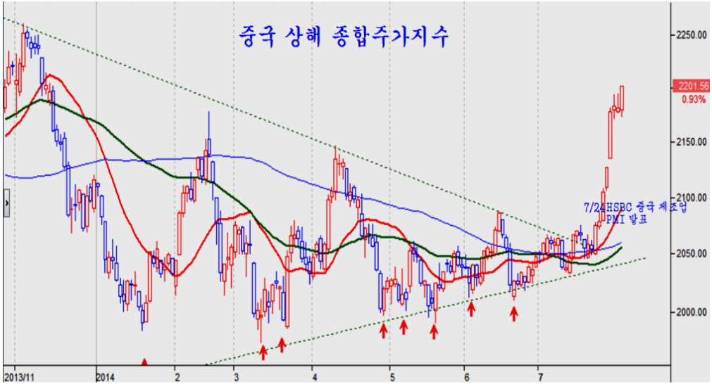 2분기 펀드 결산을 마무리하고 6월 27일부터 외국인은 적극적인 매수로 신규 포트폴리오 비중을 늘렸으나, 기관과 사모펀드의 강한 매도 저항으로 지수가 정체하였다. 그러나 선물 만기를 끝낸 중국증시가 상승 출발하고, 7월 24일 HSBC 중국 제조업 지수가 계속 확장 국면이 되자 외국인의 매수 강화와 매도하던 일부 기관의 매수 가세로 지수가 급등하였다.