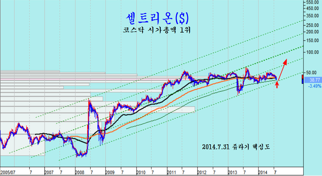 그러나 단기 급락과 함께 지수가 20월 평균과 60월 평균의 지지권에 접하여 지지가 강한 곳에 이르러 있다. 서울 반도체와 같이 기업 실적 대비 과도한 주가 수준을 유지하는 일부 종목의 하락이 있으나 하락으로 저평가된 기업들이 많고, 코스닥 시가총액 1위인 셀트리온이 장기 추세의 채널 하단에서 상승을 준비한다는 점에서 코스닥 시장은 하락이 이어지기 보다는 8월 새로운 상승을 준비할 듯 하다.