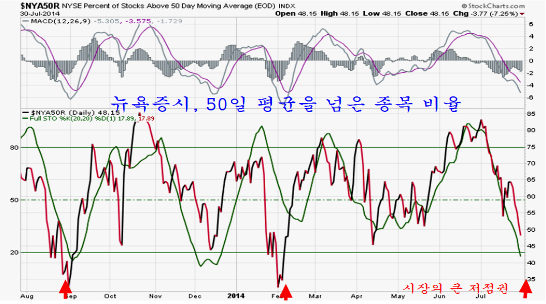 한편, 지수와 달리 시장의 등락을 나타내는 지표인 50일 평균을 넘은 종목의 비율을 나타내는 그래프는 시장의 저점권 조건을 가르키고 있다. 데이터 집계의 특성상 30일까지 등락을 반영하는 이 그래프는 31일의 조정과 함께 상승 가능한 충분한 저점권이 된다.