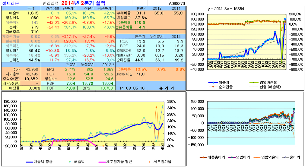 오늘 발표한 셀트리온의 실적은 매출 1615억, 영업이익 960억원으로 2013년 이후 실적 이상 감소를 벗어나 사상최고 매출과 사상 최고 이익으로 주가 상승의 발판이 되고 있다.