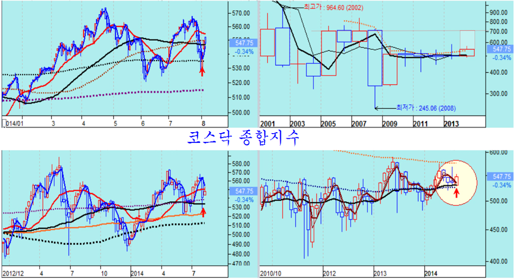 급 반등에 나섰던 코스닥 지수가 주봉 시가3선에 접하면서 조정을 거쳤다. 약한 저항권에 밀려 있으나 월봉으로 5년 평균과 10년 평균이 함께 지지하는 강력한 상승을 전개하는 과정이라는 점에서 상승 추세가 계속된다.