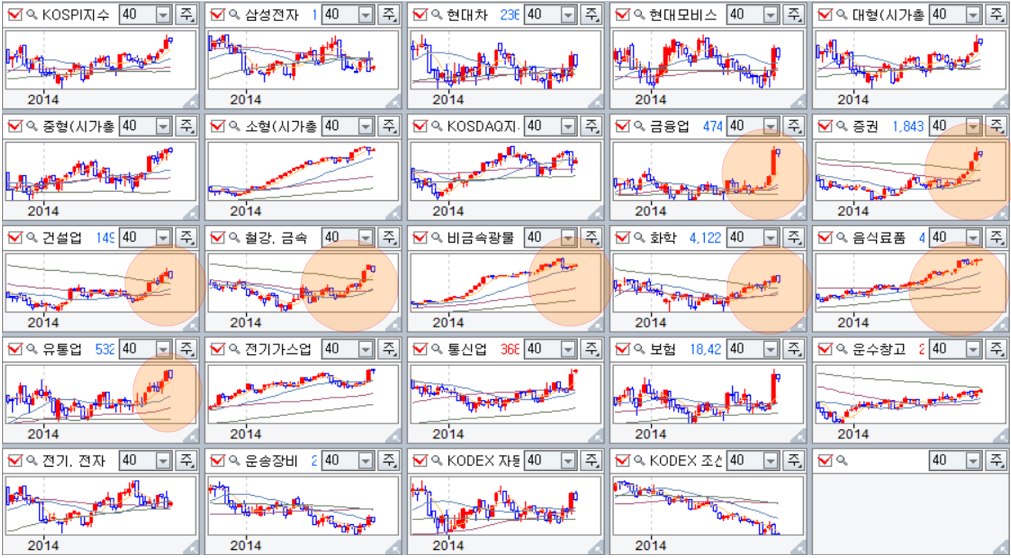 따라서 7월 박스권 돌파와 함께 월봉으로 상승 추세의 무릎을 넘어선 업종들은 하락시 매수 전략으로 가면 좋으며, 단기 변동은 매수에 이용할 뿐 거래에서 무시하면 좋다.