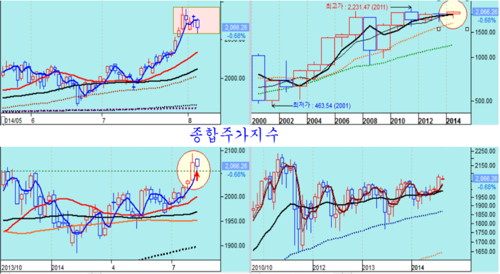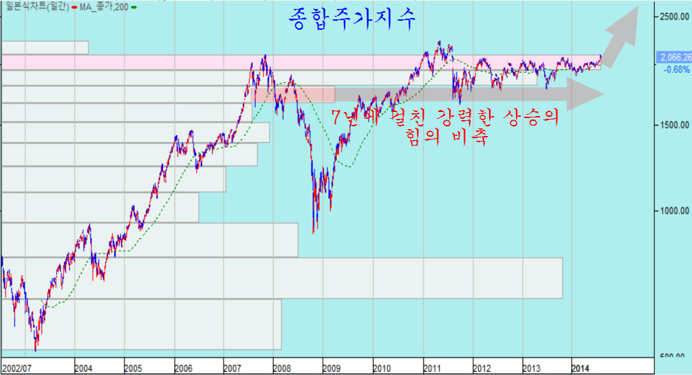 기술적인 측면에서 종합주가지수는 2007년 고점에 다가선 후 이 저항에서 숨 고르기 한 모습으로 이 저항 돌파와 함께 한층 상승의 힘이 강해지게 된다. 왜냐하면 7년에 걸쳐 개인과 기관이 주식을 팔고 외국인과 장기 수급이 주식을 매수하는 과정에서 강력한 상승의 힘이 비축되어 있기 때문이다.
