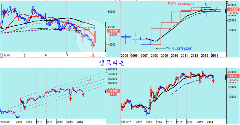 특히 연봉을 보면 2009년 장대 양봉 반등 이후 5년간 도지형의 짧은 변동을 이어왔으므로 강한 힘이 축적이 되어 있으며, 주가 리듬상 2009년과 같은 강한 양봉이 만들어질 가능성이 없지 않다. 이 경우 2005년 이후 4년간 연봉의 시가 또는 종가를 형성했던 지수 700이 연말 고점이 될 수 있다.