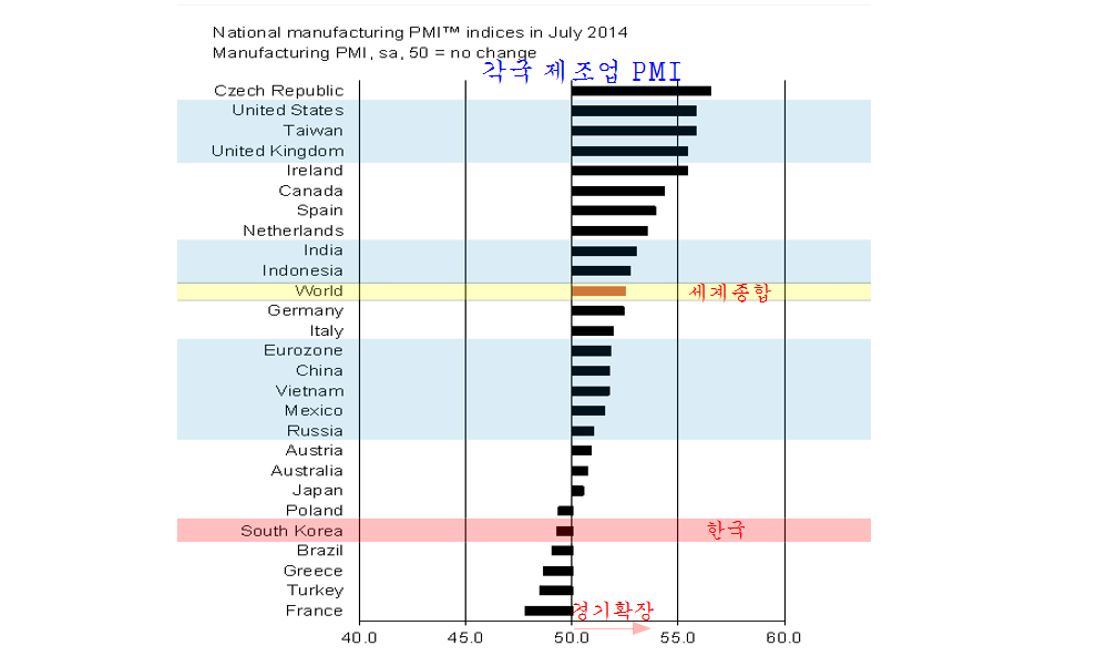 유럽의 경우 자금이 풀리면서 제조업 보다는 서비스업 경기가 먼저 호전되고 있다. 제조업과 서비업 경기를 종합한 종합 PMI 지수는 2000년대 활황기 못지 않는 수준을 나타내고 있다.여하튼 이제 한국도 돈을 풀고 있으니 이 세계적인 제조업 경기 회복에 동참하게 된다.