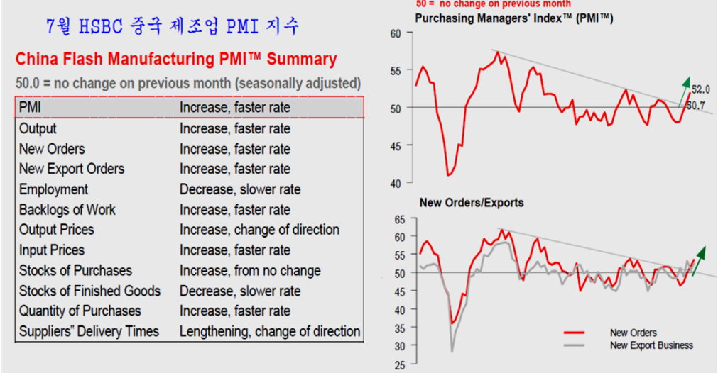 중국이 부동산을 잡느라 꽉 조였던 돈줄을 풀자 중국 경기가 대단히 활발히 살아나고 있다. 중국 제조업 PMI 지수는 50을 넘어 52로 가파른 상승을 하고 있다.