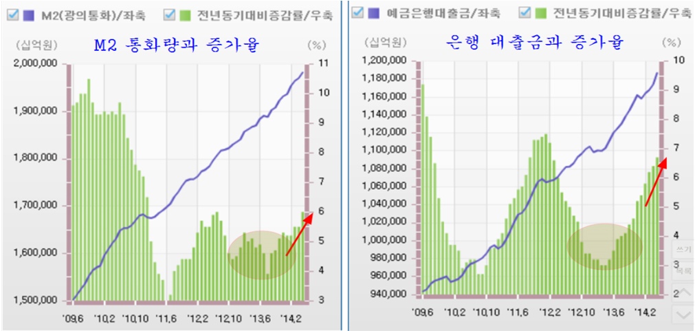 한국 역시 이런 흐름에서 벗어나지 않는다. 통화 공급이 수년래 가장 빠른 속도로 풀리고 있으며 가계와 기업에 대한 대출 역시 마찬가지이다. 이렇게 돈이 풀리면 경기도 호전되고 주가도 상승하며 부동산도 오르게 마련이다.