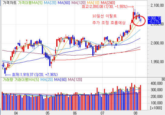 지수 포인트로 볼 때 추가조정이 이어진다면 2045포인트 정도를 예상해 볼 수 있겠다.