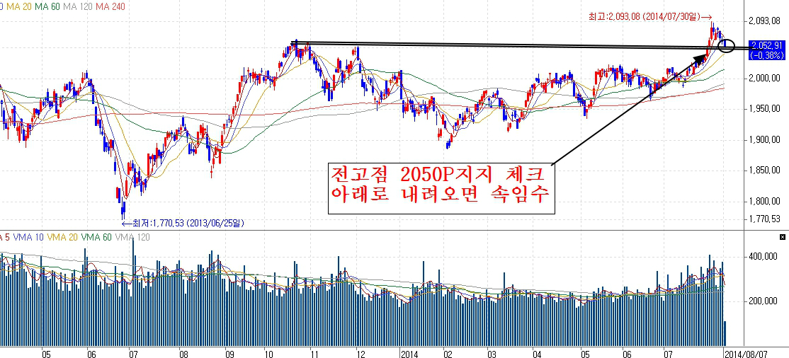 거래소는 2080을 돌파했지만 이전고점까지 조정을 받고 있는 상태입니다. 2050p를 기준으로 지지를 받아준다면 추가상승을 기대해 볼 수 있지만 이것이 하항이탈 당하면 속임수로 볼 수 있습니다.