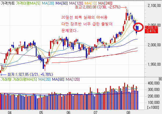 기술적 흐름으로 보면 지수는 20일선 회복에 실패하고 말았다.