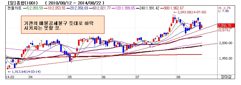 위는 종합지수 일봉차트이다. 옵션만기이후 기관은 인위적으로 시장을 꺽기 위하여 매물공세를 퍼붓고 지난 목요일의 경우에는 중국의 PMI지수를 빌미로 시장을 꺽으려 하였다. 그러나 상해지수는 소폭 조정하는 선에서 마감을 하였고 금요일에는 목표일 조정분을 전부 회복하면서 마감하였다. 상해지수의 견고한 모습을 보여주고 있다.
