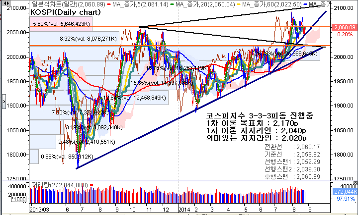 코스피지수 3-3-3피동 진행중이며 1차 이론 목표치 : 2,170p 1차 이론 지지라인 : 2,040p 의미있는 지지라인 : 2,020p으로 설정해 드린다.
