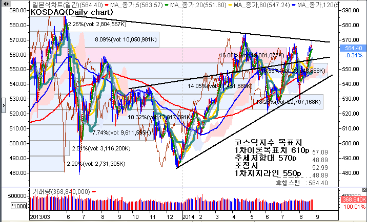 코스닥지수 지수는 3-3파의 진행중이며 지수 목표치는 1차이론목표치 610p, 추세저항대 570p, 조정시 1차지지라인 550p 전후로 설정해 드린다.