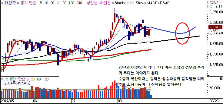 전자와 같이 20선과 60선의 이격을 좁히는 방향으로 진행될 경우와 20선의 하락각 초입을 상승각으로