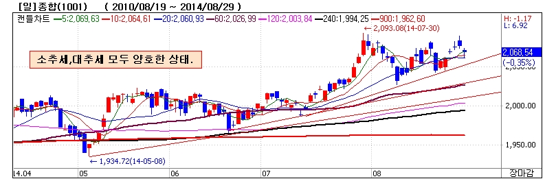위는 종합지수 일봉차트이다. 지난 주간내내 기관은 시장에 매물을 퍼부었다. 그럼에도 불구하고 상승세는 계속 이어지는 모습을 보였고 양호한 수급상황을 보였다. 금요일에는 기관의 1,216억에 이르는 매도세에도 불구하고 외인의 1,549억 매수세가 유입되었다. 금요일 기관의 매물로 인하여 시장은 소폭 하락하면서 마감하였다. 이변이 없는한 주초반 매물공세가 좀 이어진다고 하여도 전체적으론 상승세를 보일 모양이다.